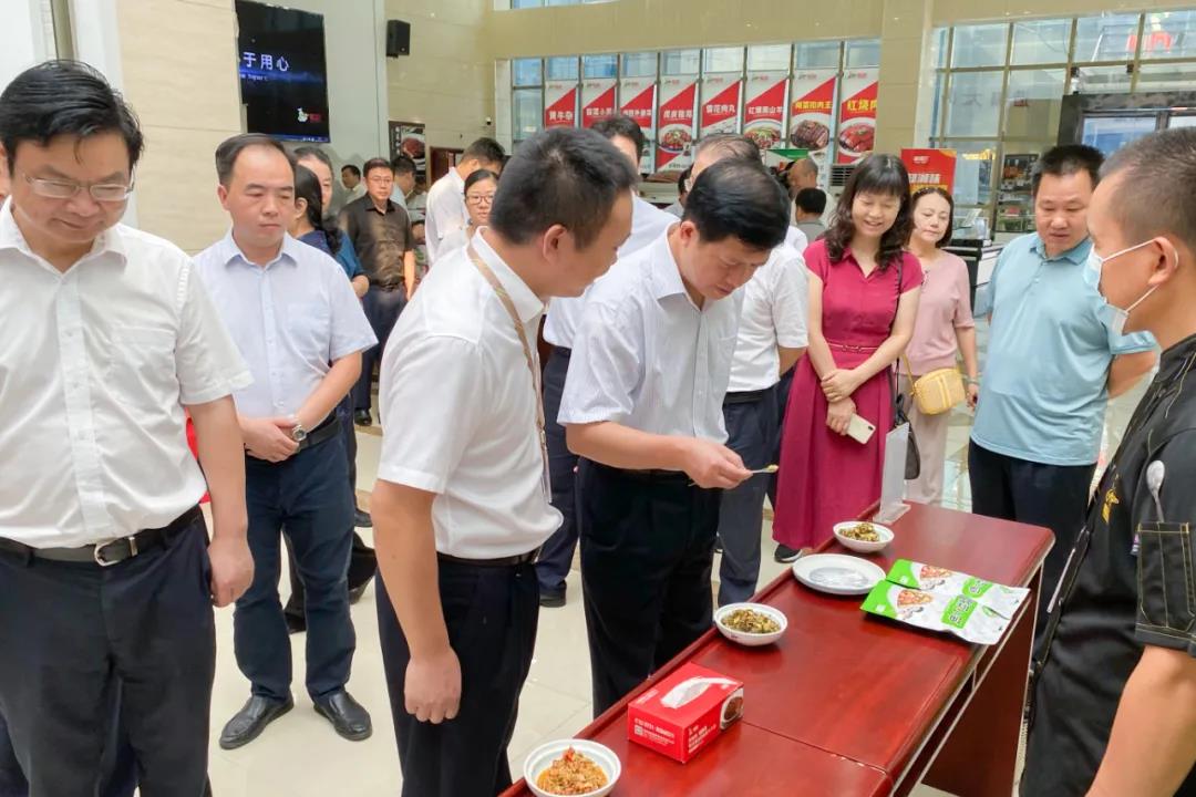 一行人参观至直播间,开云kaiyun(中国)项目部扣肉分厂产品经理林辉彬正在展示产品出品,扣肉出锅、倒扣入盘,行云流水的操作让参观众人惊艳不已,袁厅长笑谈:“看着就很棒了,”同行领导也纷纷赞赏,造型色泽都很不错、很有食欲,林大师向众人介绍了开云kaiyun(中国)梅菜扣肉简单的食用步骤,开云kaiyun(中国)梅菜扣肉这款产品经久不衰,其中很大一部分原因是因为我们有自己的无沙免洗梅干菜基地,有独特的香味,再搭配上高品质的五花肉,肥而不腻、回味无穷。